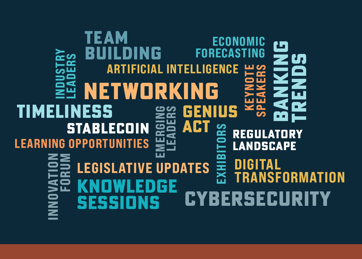 Word cloud that showcases what past Annual Convention attendees found valuable about the event, including team building, banking trends, keynote speakers, regulatory landscape, and more.